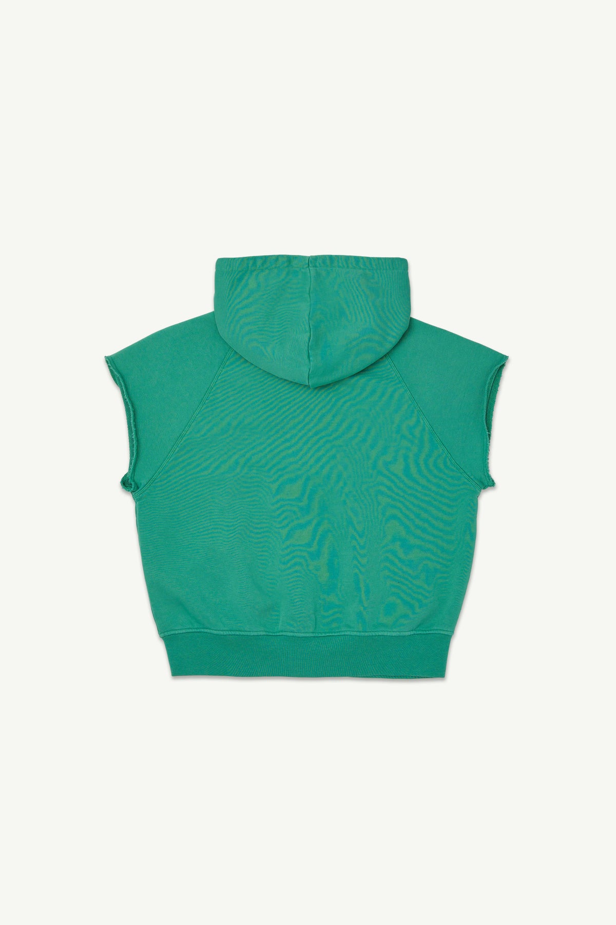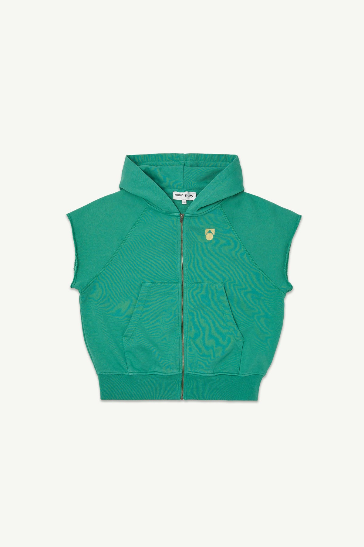 Our zipped Hooded Tank in Bottle Green is crafted from soft organic cotton sweatshirt jersey fleece. With a roomy, raglan cut off sleeve with raw finish, ribbed hem and double-layer hood, it's a lovely blend of comfort and style, perfect for layering or wearing on its own.