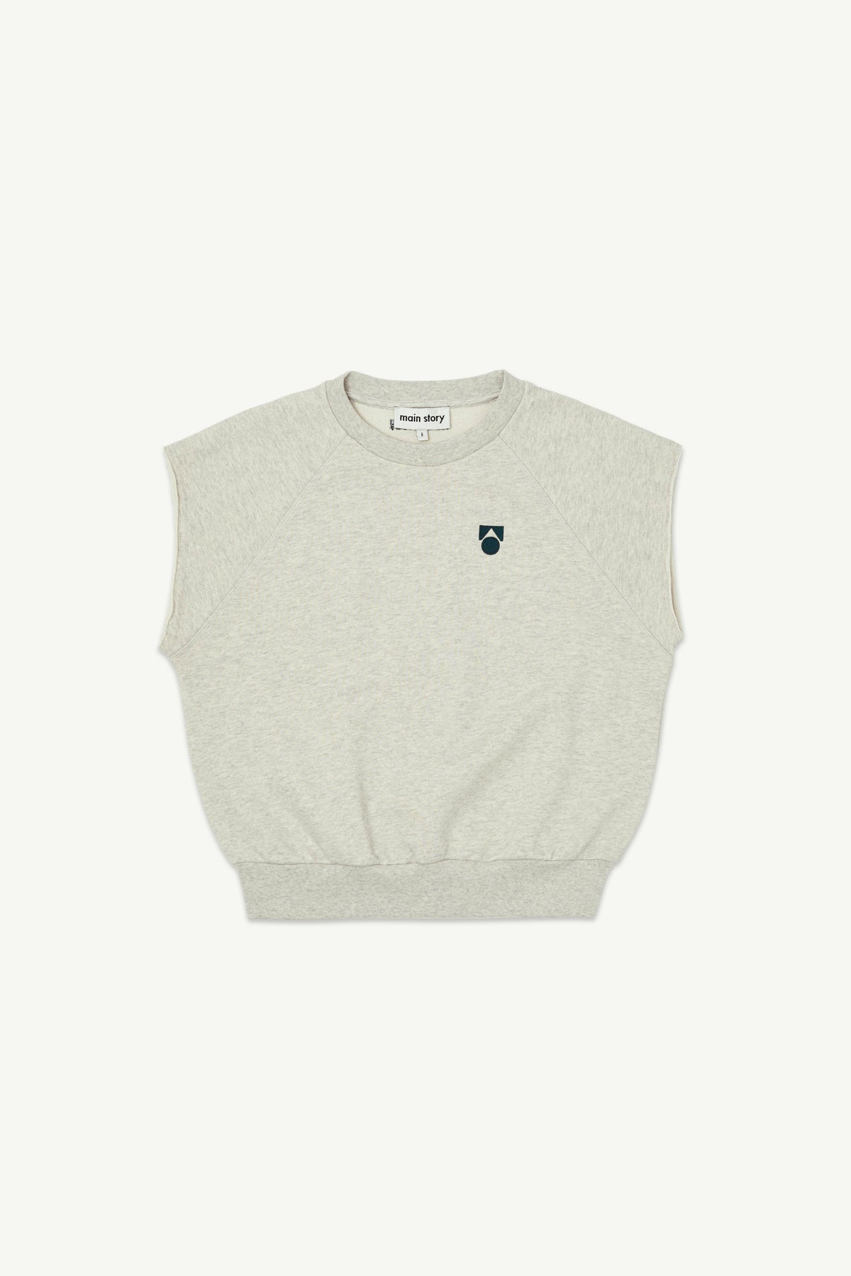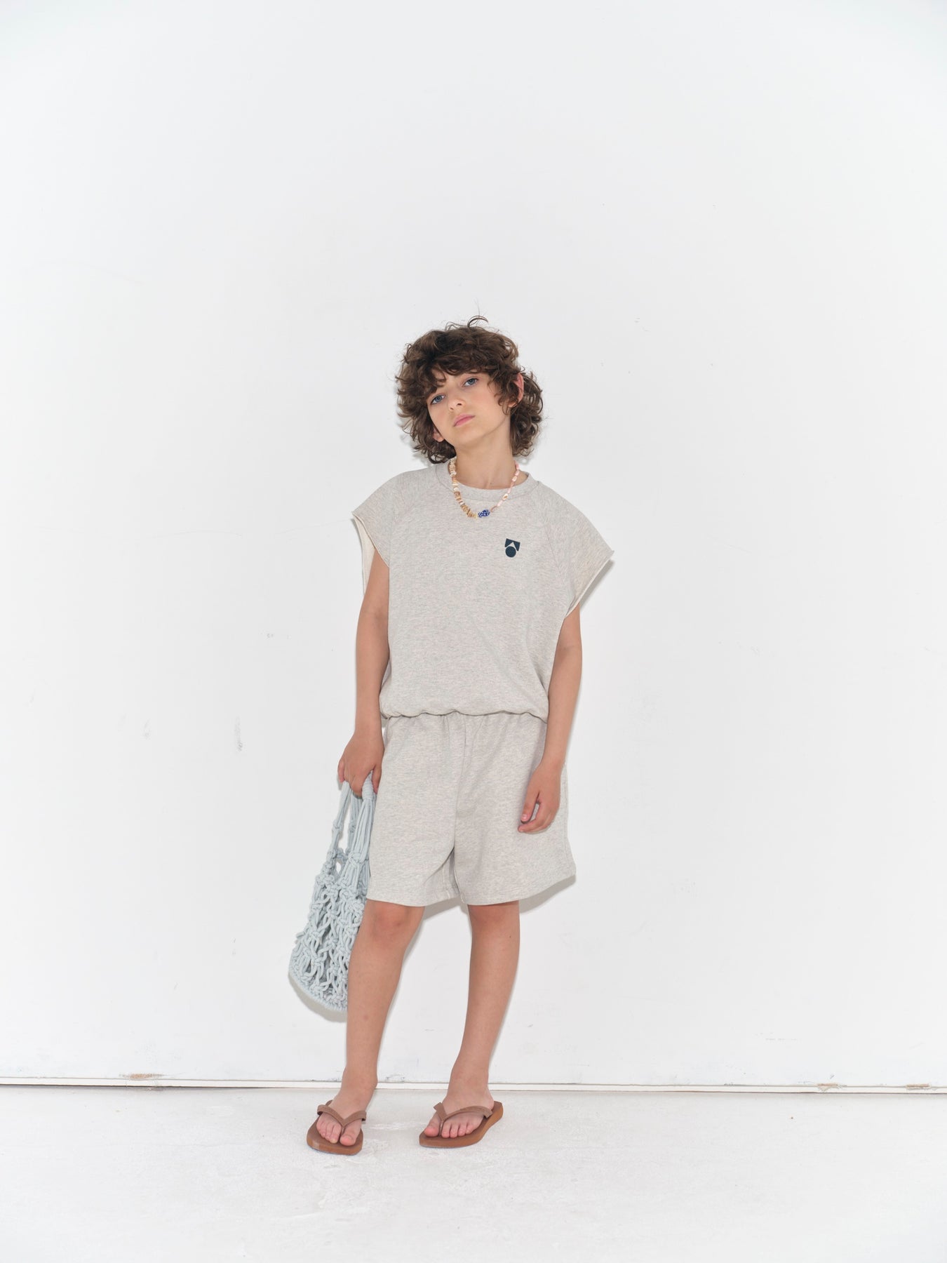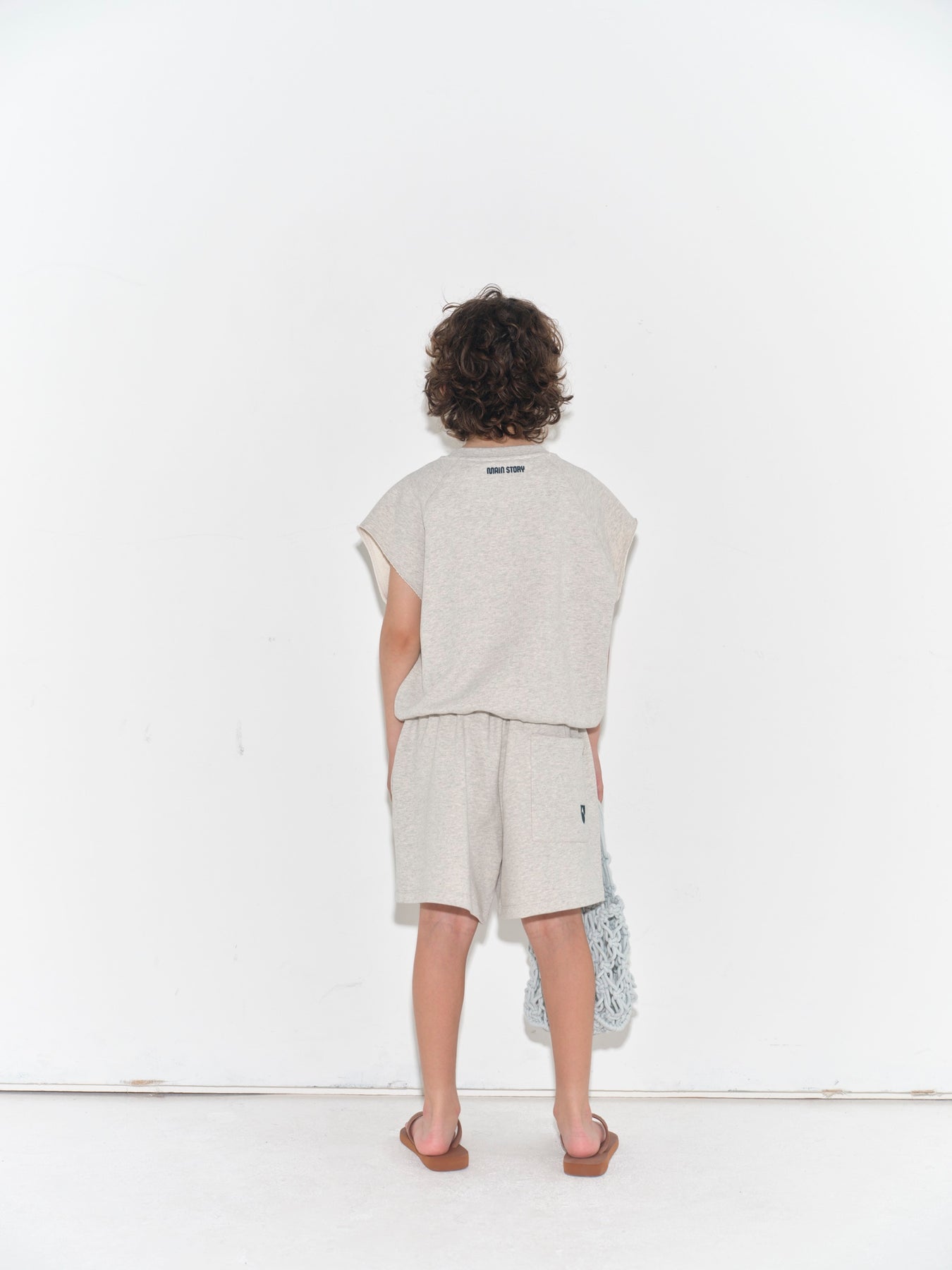 Our sleeveless Tank in Ecru Melange organic cotton jersey fleece has a roomy, raglan oversized fit. Designed with cut off sleeves and a ribbed neck and hem, it mirrors the relaxed silhouette of our oversized sweatshirt, making it a versatile piece that transitions seamlessly across seasons.