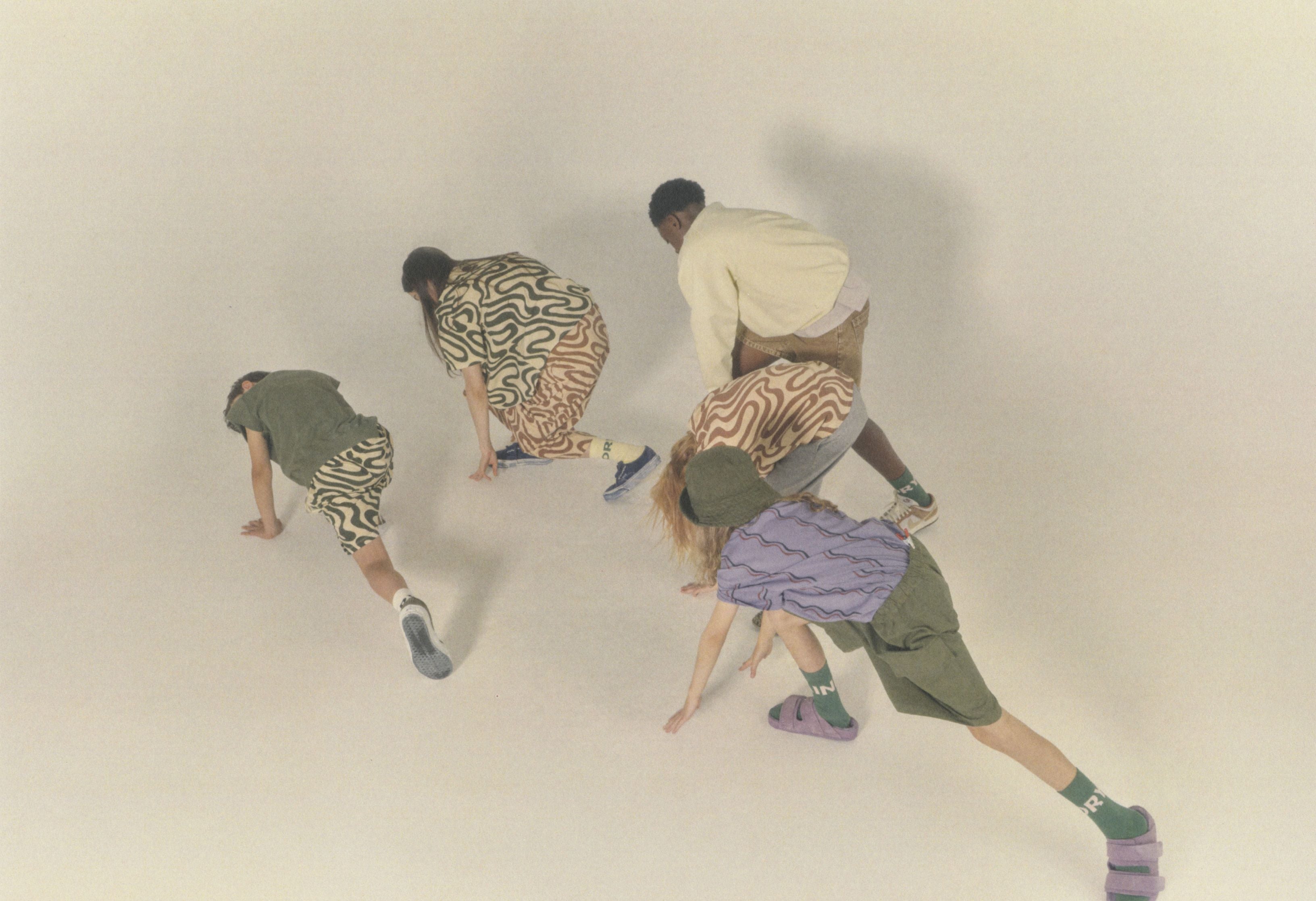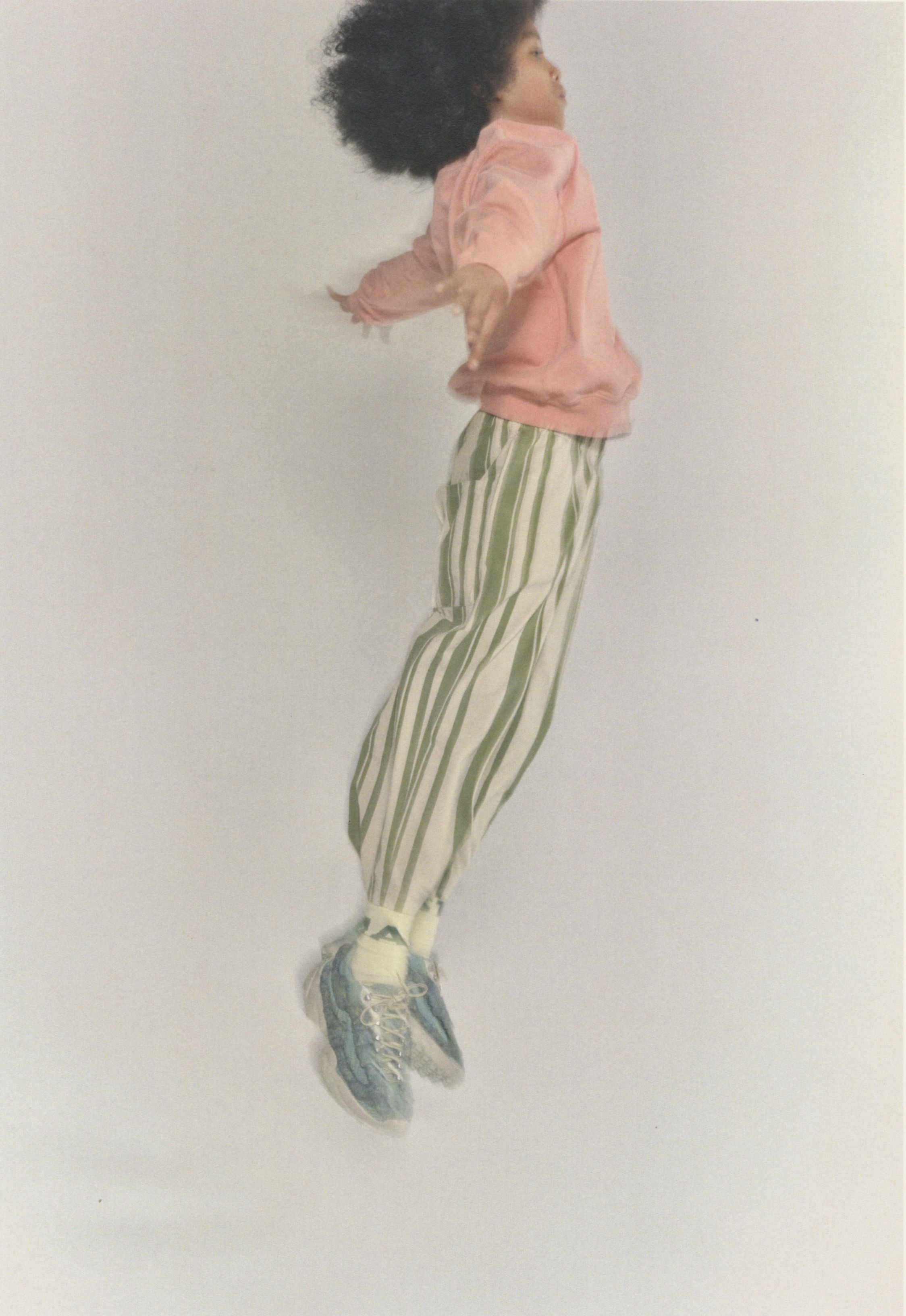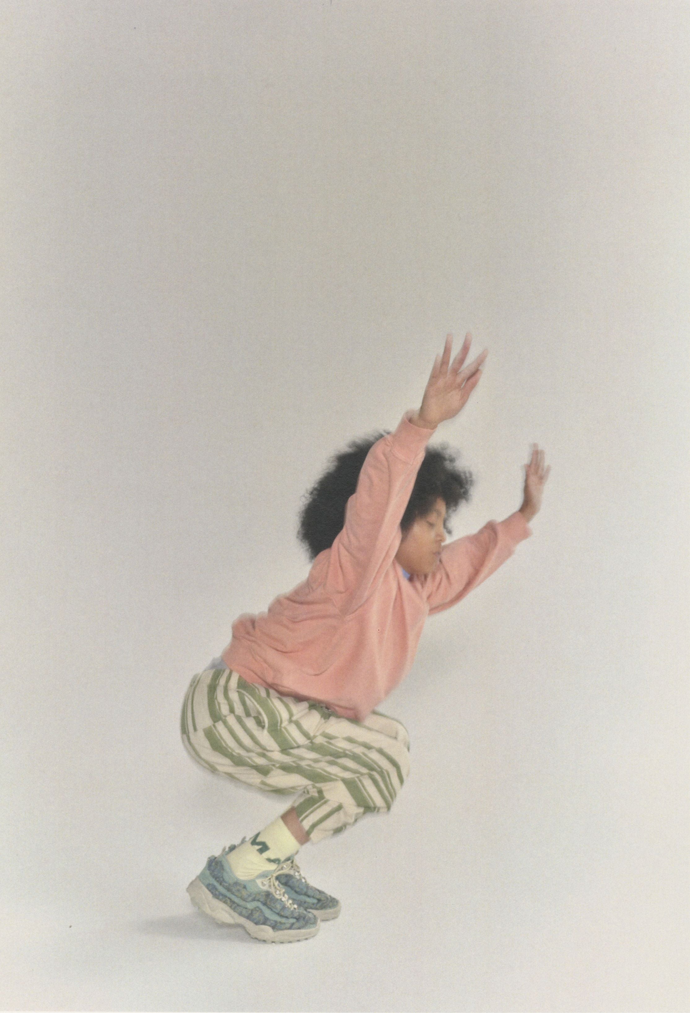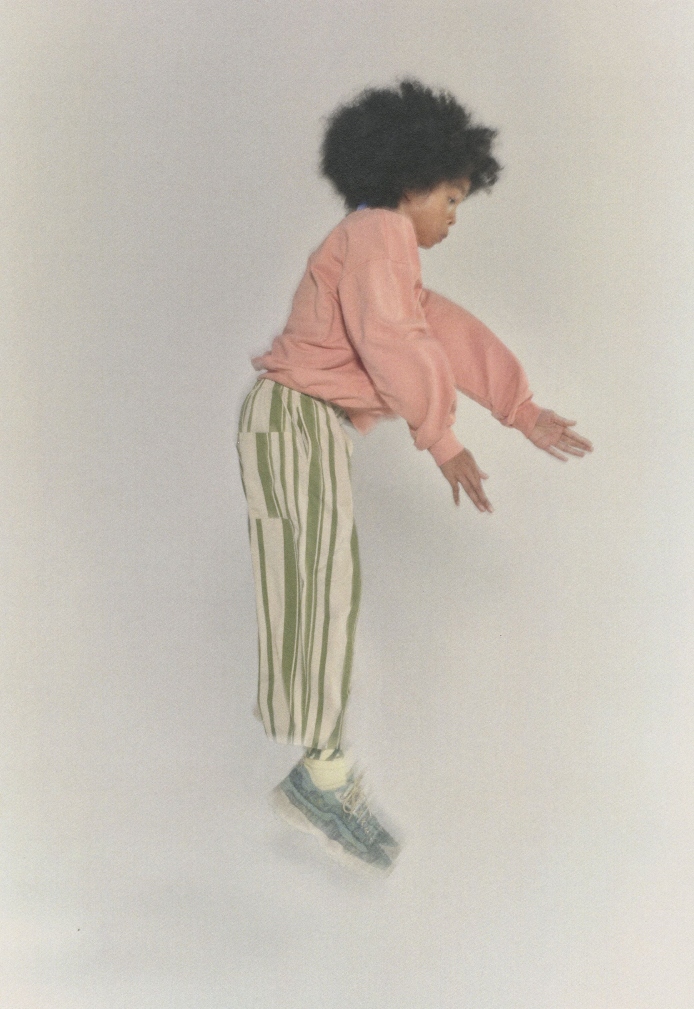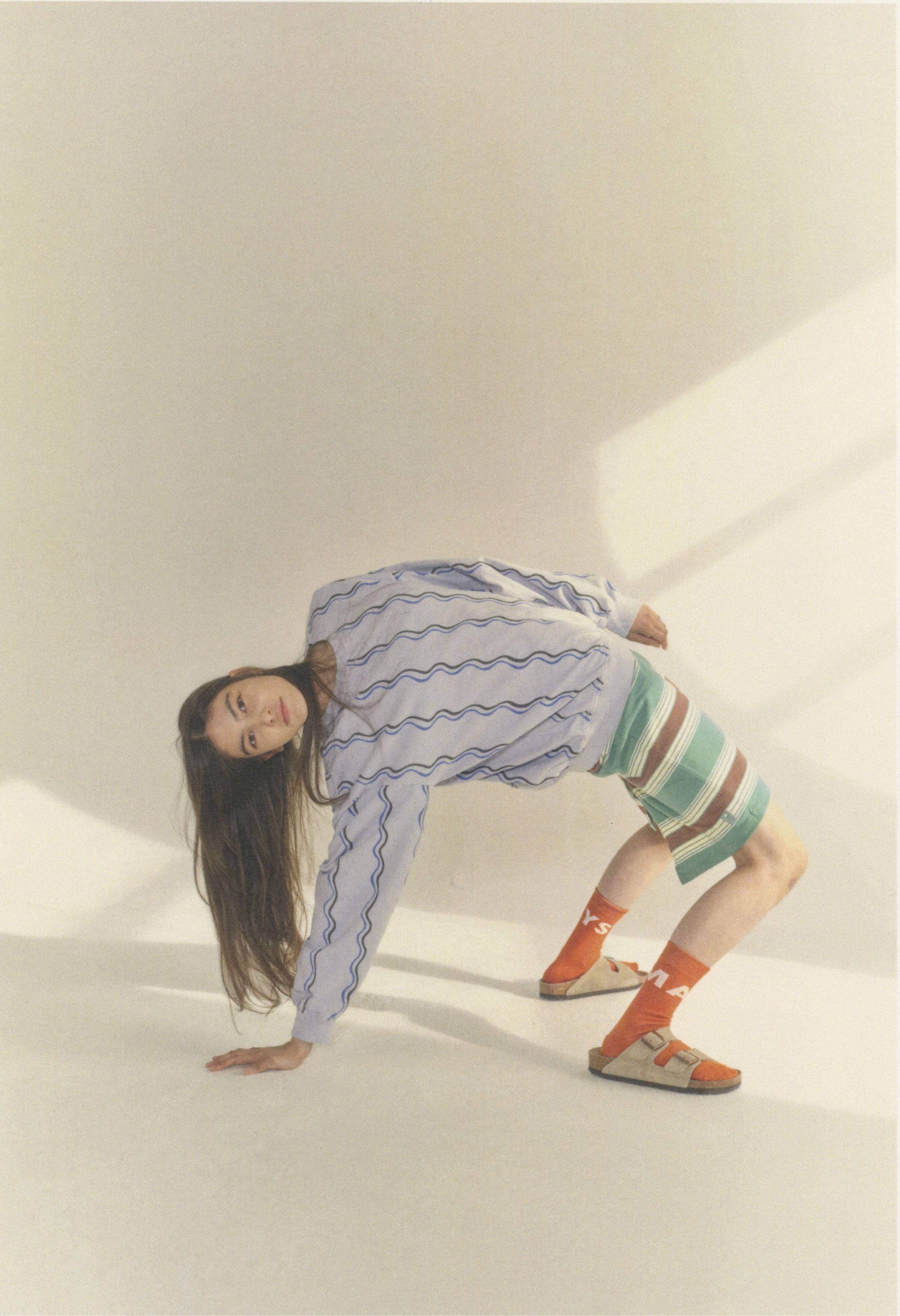 In a studio the group of friend’s dance, contort, twist, and jump, never letting the dust settle, celebrating the transformative power of colour and in their beautiful chaotic energy. Here, clothing and comfort intertwines with colour and movement, creating a living tapestry of art and expression.
